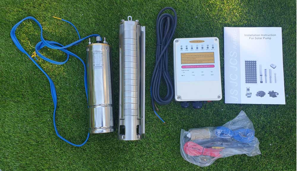 Off Grid Stainless Steel 4 inch submersible Bore Pump with MPPT Controller. Requires three high wattage house solar cells in series, full instructions provided.